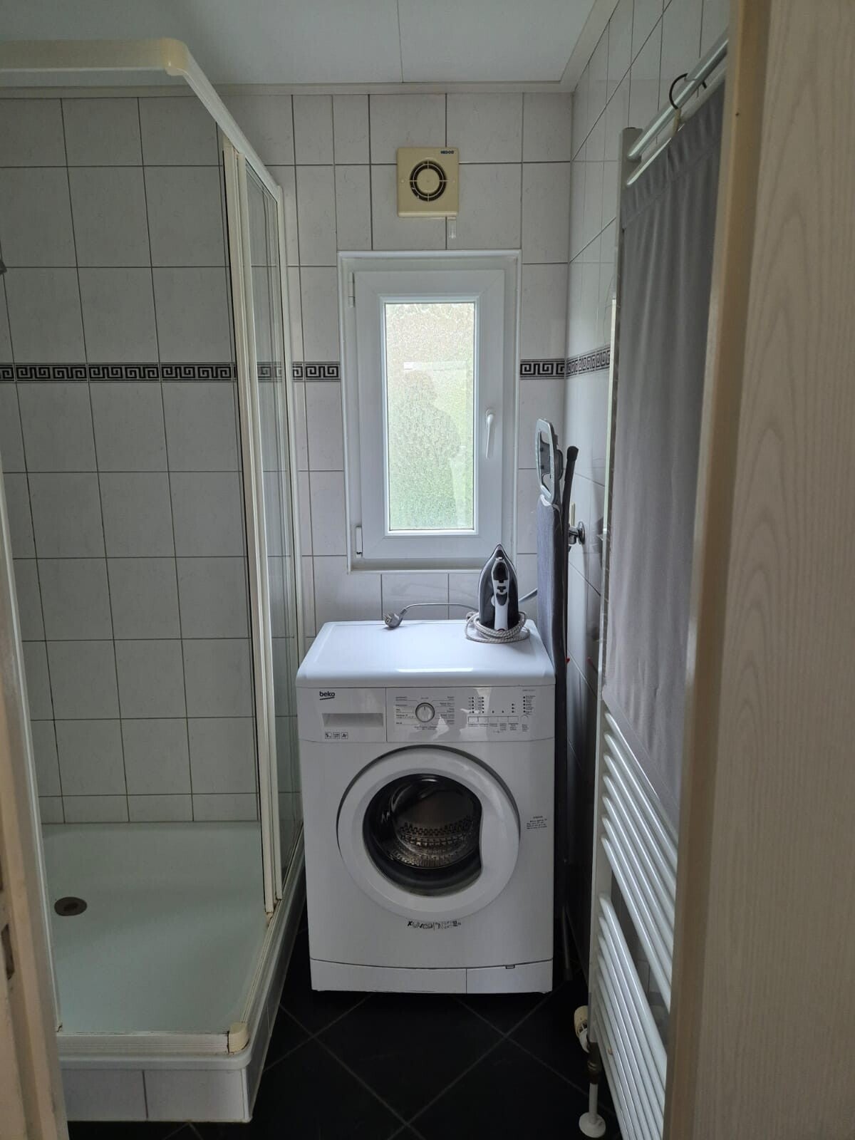 - Badkamer met douche, was meubel en wasmachine